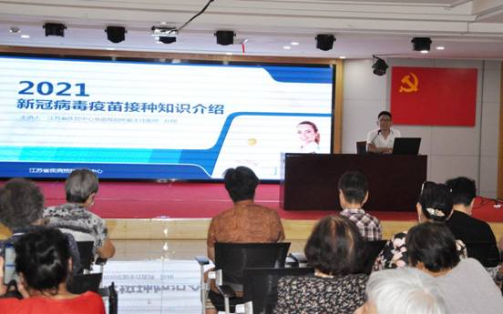 随后,江苏省疾控中心免规所副主任医师孙翔以《关于新冠疫苗接种的那些事》为题进行了专题科普讲座,以目前群众接种疫苗时常见的疑惑为切入点,围绕全球新冠疫情现状、国内新冠疫苗种类、疫苗接种禁忌、重点人群的接种、接种后反应处理及接种后注意事项等六方面深入浅出地向居民讲解了新冠疫苗接种的相关事宜,建议在接种年龄范围内,并且没有接种禁忌情况下,大家都应尽早接种疫苗。并提醒大家接种疫苗并不是一劳永逸,在接种疫苗后仍需做好个人防护措施。
