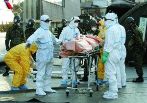 3月13日,在日本福岛县郡山市,身着防护服的工作人员将一名疑似受到辐射影响的患者用毯子包裹,送入救护车。 新华社发