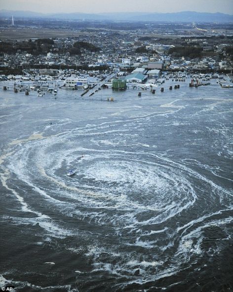 这是日本东北海岸11日发生大地震后,大洗町(Oarai)港口附近一个由海啸激起的巨大漩涡。月球活动会引起潮汐波、火山爆发和地震的消息公布两天后,日本遭到地震袭击。