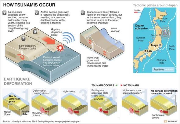 英国地质调查局(BGS)的罗杰·穆森博士解释说,太平洋板块俯冲到日本地下,引发这次地震。他说:“太平洋板块是组成地壳的最大的构造板块之一,它俯冲到日本地下,引发这次地震。它一直在向下移动,但是由于向下俯冲的步伐被挡住,它停止前进几十年,最后终于断开,它突然迅速向下俯冲,在这个过程中它变弯,突然打破数百平方公里的海床的平静,激起大量水柱。这些水以波浪的形式向四面八方奔涌而去。”上个月发生的新西兰地震是由太平洋板块被迫下沉到印度—澳大利亚板块引起的。(秋凌)