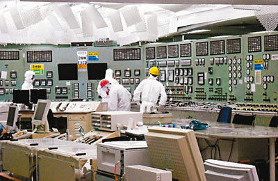 福岛核电站的控制室在地震后严重损毁,天花板剥落,员工穿保护衣抢修组件。