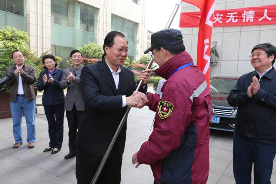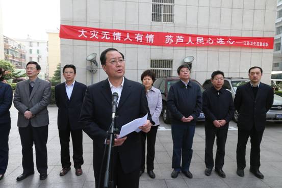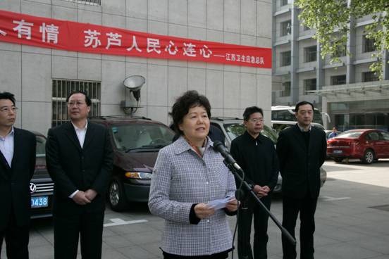 4月21日8时30分,省卫生厅在大院前广场举行简短的首支国家卫生应急队(江苏)出征四川雅安地震灾区救援仪式。副省长毛伟明代表省政府出席。省卫生厅厅长、党组书记王咏红主持。省政府办公厅副主任陈少军,省卫生厅全体领导、相关处室和派员单位负责人参加仪式。