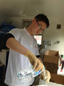 因为我们刚来,移动水质检测车中的检测试剂都是理化所所长马永建21日一大早组织人员紧急配好,随保障车队从南京拉来的,没有影响检测工作,车内无水无电,只能用矿泉水代替检测用水,用空矿泉水瓶代替实验用器皿,实验条件虽然相当艰苦,但检测工作进展很快,晚上7点天黑前顺利完成,出具了江苏省卫生应急总队入川后的第一份应急救援检测(苏川防)2013001号报告。