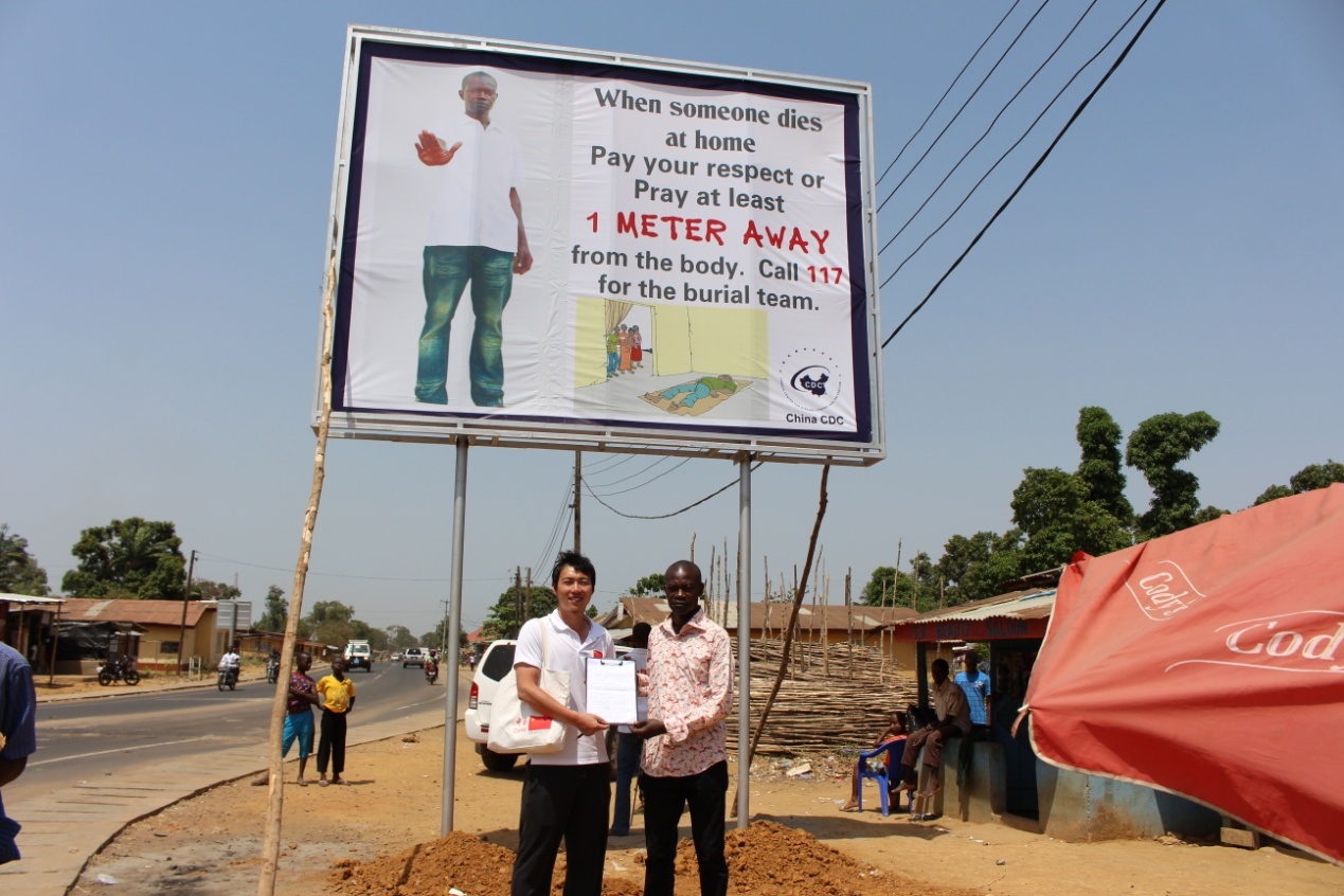 中国援塞公共卫生培训队为让弗里敦各主要交通干道埃博拉防控知识宣传标语走进农村,最大限度覆盖低收入低教育水平农村人群,扫清城市宣传盲区,培训队决定开展ITERP项目的Jui、Kossoh town和Grafton三个村庄全部建立大型埃博拉防控宣传广告牌。中国援塞公共卫生培训队队员、江苏省疾控中心霍翔通过社区走访、人员讨论等大量细致的前期准备,确定在三个村庄人口最密集集市或交通节点安装大型宣传牌,最大程度保证人群“117”埃博拉热线和安全丧葬等宣传信息的覆盖面和可及性。
