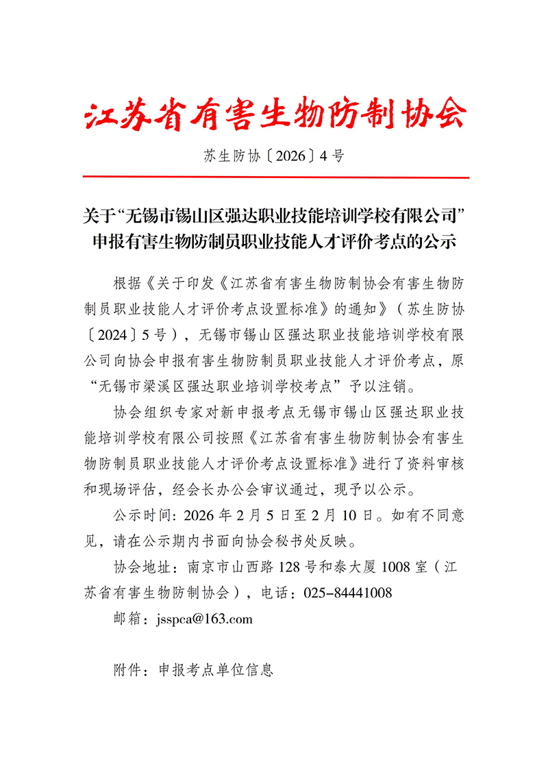 关于“无锡市锡山区强达职业技能培训学校有限公司”申报有害生物防制员职业技能人才评价考点的公示