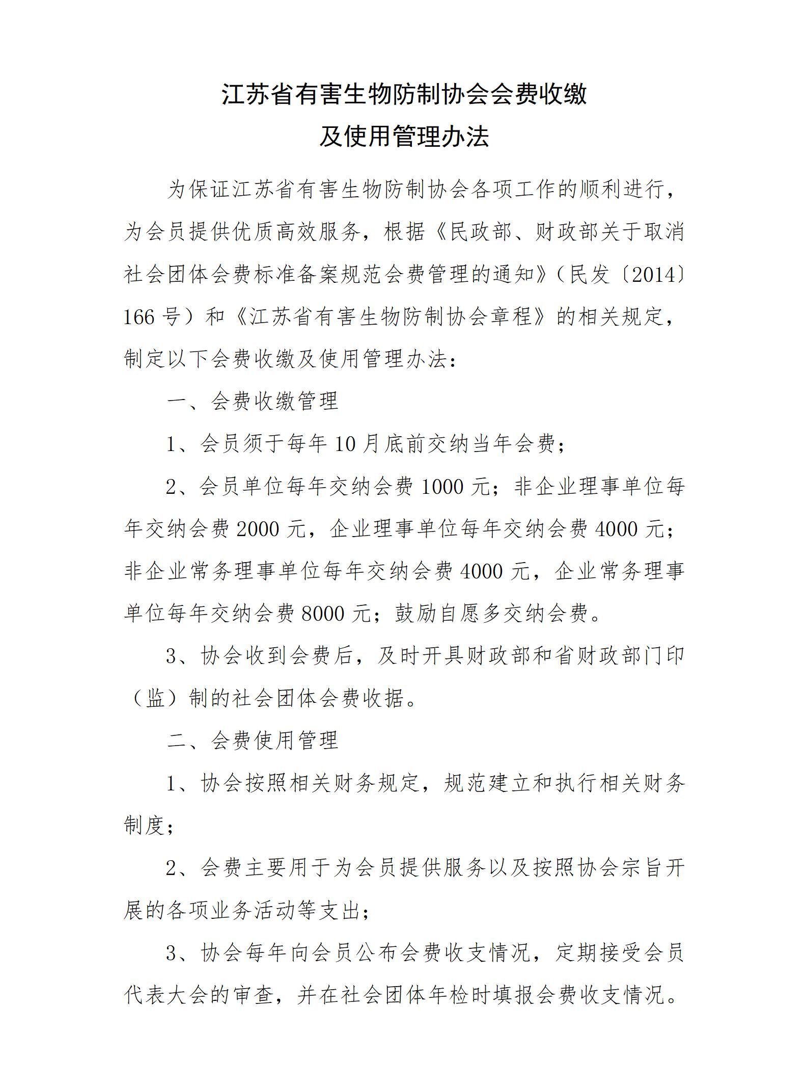 江苏省有害生物防制协会会费收缴及使用管理办法