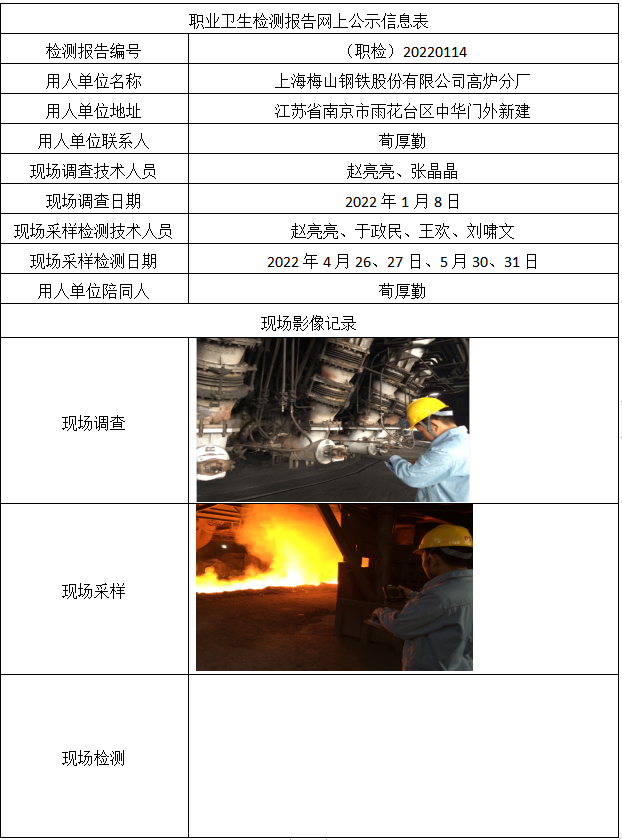 (职检)20220114-上海梅山钢铁股份有限公司高炉分厂职业卫生检测报告网上公示信息表