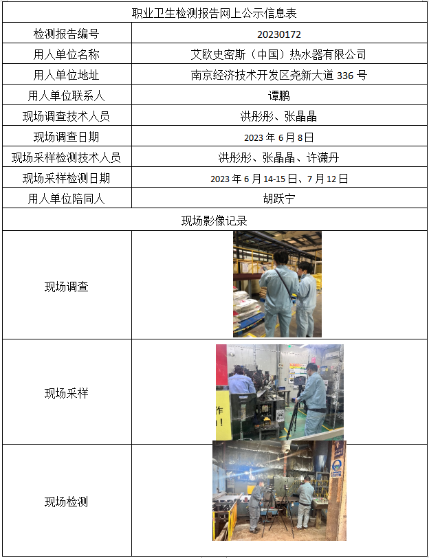 (职检)20230172-艾欧史密斯(中国)热水器有限公司职业卫生检测报告网上公示信息表