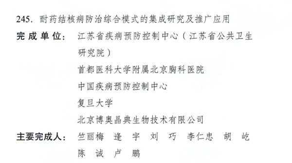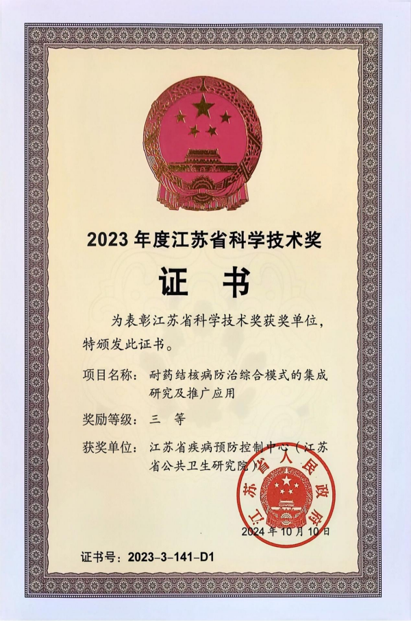 近日,江苏省人民政府正式公布了2023年度江苏省科学技术奖获奖名单。江苏省疾病预防控制中心慢性传染病防制所作为第一完成单位申报的《耐药结核病防治综合模式的集成研究及推广应用》项目获得江苏省科学技术奖三等奖。
