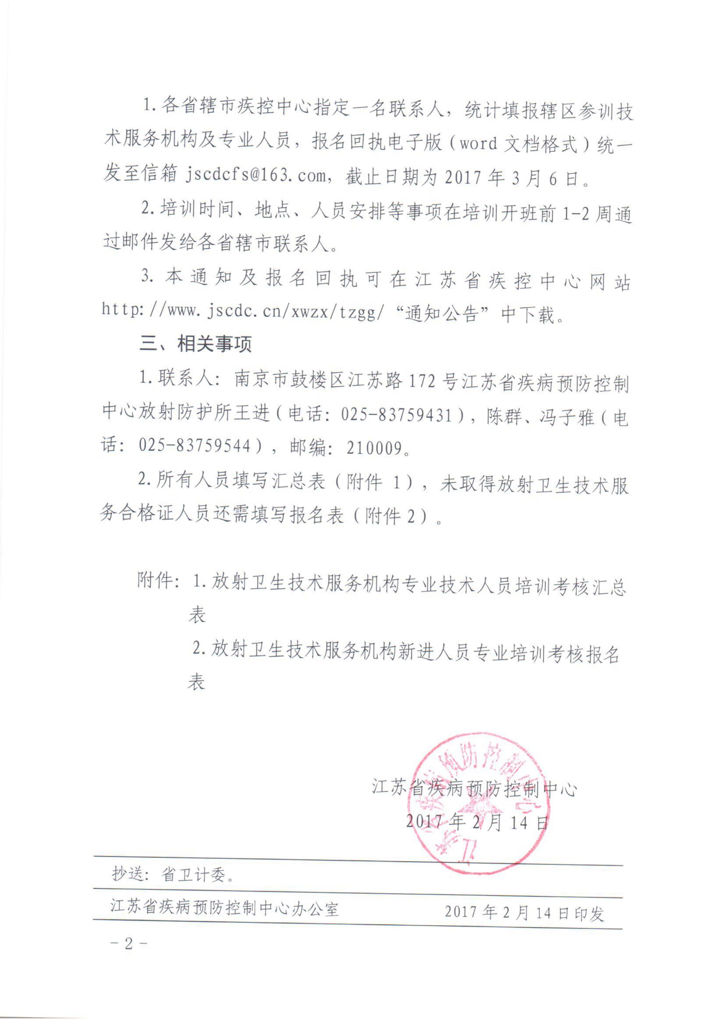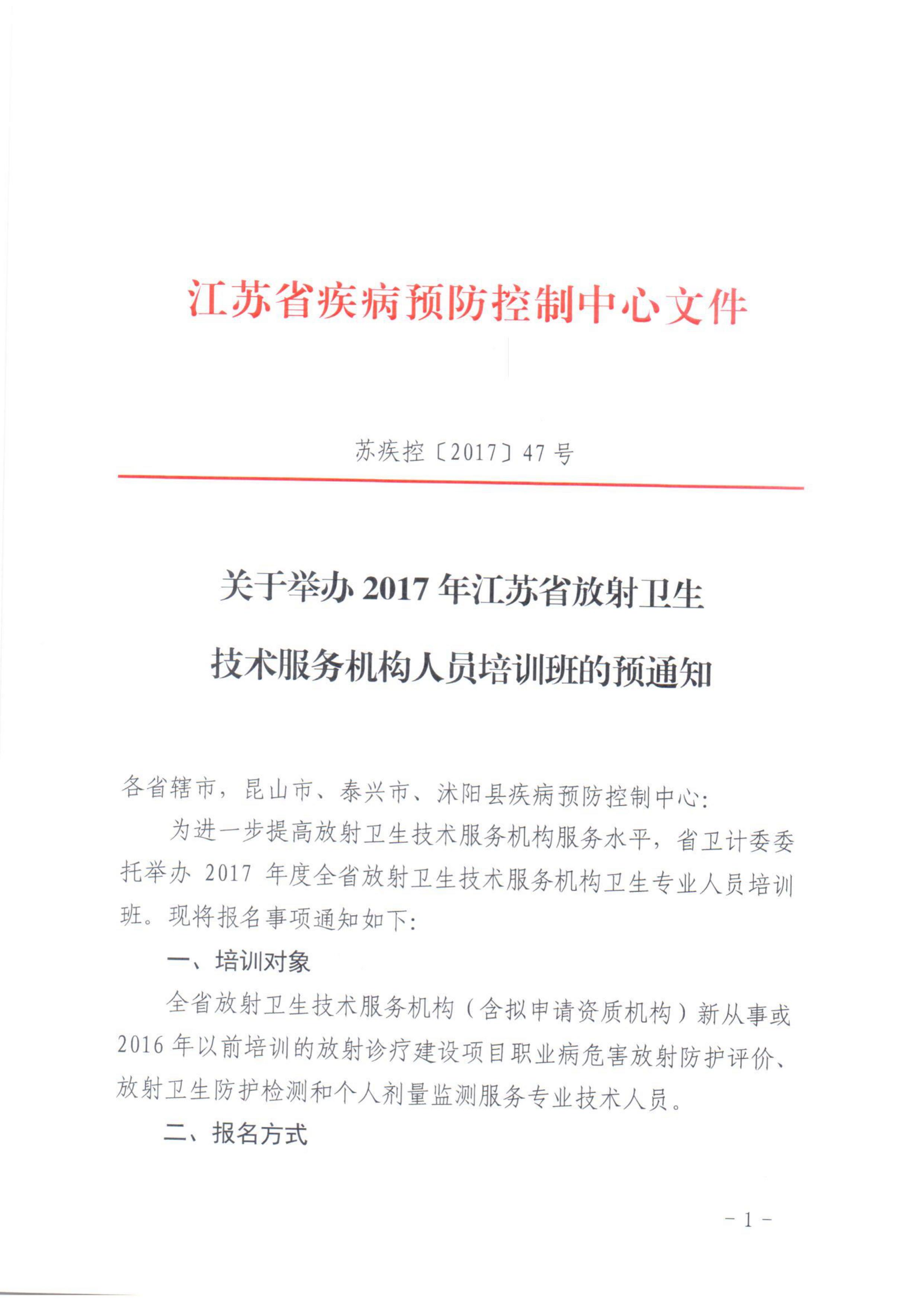 关于举办2017年江苏省放射卫生技术服务机构人员培训班的预通知