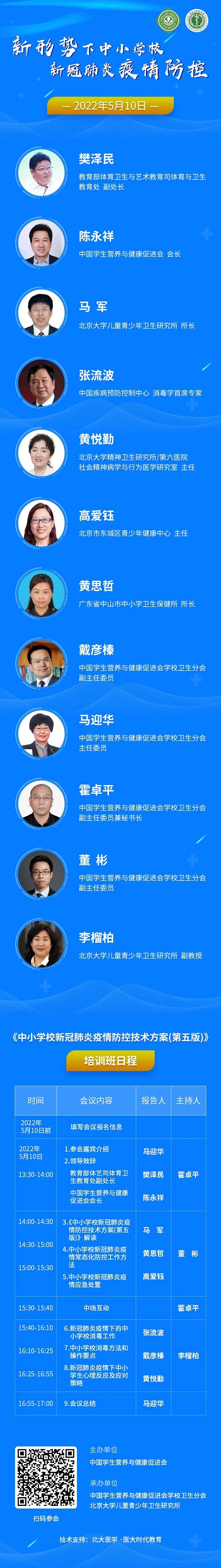 为推进中小学新冠疫情防控行动的实施,中国学生营养与健康促进会学校卫生分会定于2022年5月10日(周二)下午13:30线上举办《中小学校新冠肺炎疫情防控技术方案(第五版)》培训班。讲课的老师都是国家级学校卫生领域专家,欢迎大家转发并学习~