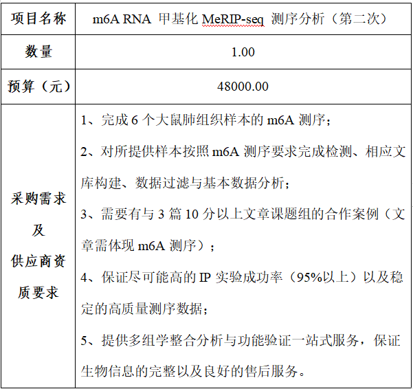 2024年度采购需求公告(第267批)m6A RNA 甲基化MeRIP-seq 测序分析(第二次)