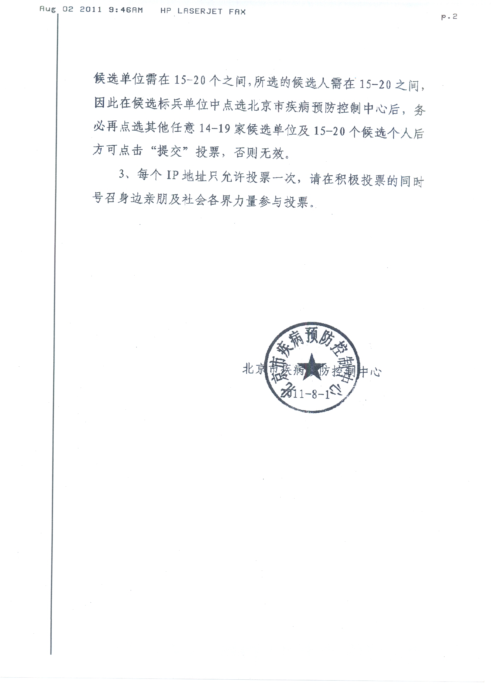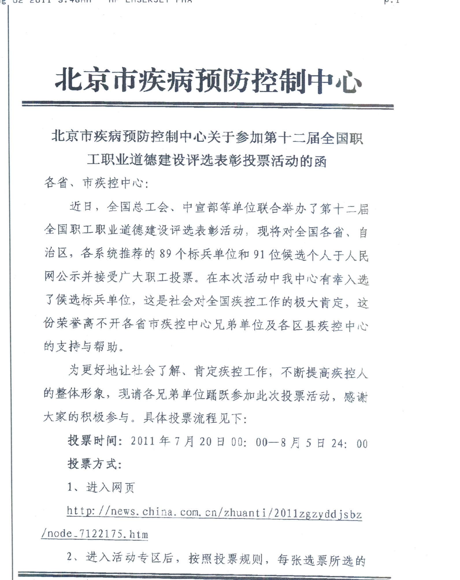 北京市疾病预防控制中心关于参加第十二届全国职工职业道德建设评选表彰投票活动的函