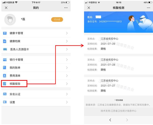 1.在微信中搜索公众号“江苏健康通”关注进行注册查看。