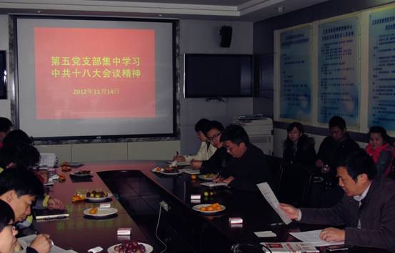 2012年11月14日,中心第五党支部在B楼三楼会议室集中学习中国共产党第十八次全国代表大会会议有关精神。