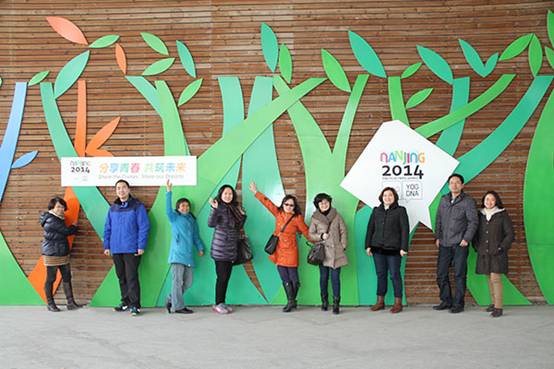 首先,我们来到了位于南京绿博园的青奥组委会进行参观活动。工作人员向我们展示了南京青奥会的会徽、会旗及运动项目图标,并介绍了青奥会的相关筹备情况。大家饶有兴致地参观了组委会办公室,观看了青奥宣传片,还在网球纪念墙前签名留念,以特别的方式参与到青奥会中。