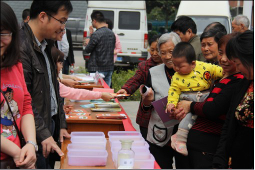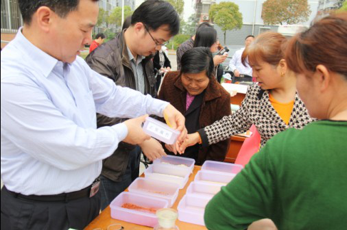 上午10点,党员工作队一行32人来到江宁区谷里街道新民花苑小区广场,大家分工合作,设立展台,布置展板,营造浓郁活动氛围,周边群众很快汇聚过来。党员同志们主动迎上去,一边发放食品安全主题海报、科普折页、宣传袋册,一边做详细讲解;食品安全专家与群众面对面交流,解疑答惑,气氛热烈;青年党员着力宣传中心微博、微信提供的食品安全信息资讯,倡导公众形成健康饮食方式。现场共发放各类食品安全相关主题宣传材料500余份,接待群众咨询近50人次,取得满意效果。