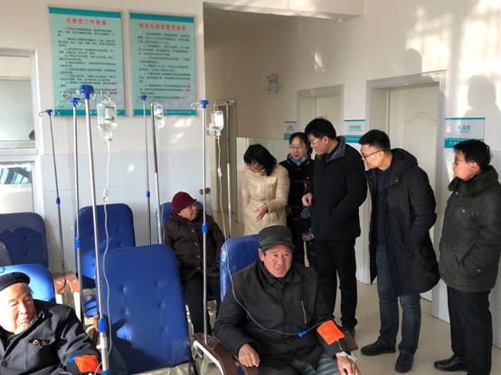 在顺河镇镇长刘博陪同下,徐燕副主任一行来到顺河镇大圣村级综合服务中心,了解大圣村“健康小屋”建设进展,徐燕副主任还向医护人员详细了解了大圣村“家庭医生”签约服务和慢病管理进展情况,慰问了正在医务室看病的村民。在随后举行的座谈会上,丰县卫计委副主任史公福和顺河镇镇长刘博分别介绍了丰县健康扶贫和顺河镇经济社会各项事业发展情况,对徐燕副主任一行冒着严寒赶来调研慰问表示热烈欢迎和诚挚的感谢!周连同志汇报了大圣村2016-2017年帮扶工作总结情况,他说自2016年2月入驻丰县开展帮扶以来,在后方单位的大力支持下,带着感情,带着责任,合理利用多种资源,嫁接各种要素,多渠道深入推进产业、民生、健康、文化等各项帮扶工作顺利开展,做成了诸如:投资190万新建大圣村“屋顶分布式光伏发电”项目;筹资30余万新修6条村内水泥路1745米;新建700多平米村级服务中心(包括省级示范卫生室、1000多平米健康文化广场);建立“科普中国.乡村e站”、“数字农家书屋”;签订“城乡结对 文明共建”帮扶协议,形成帮扶合力等落在实处的帮扶工作,为顺河镇大圣村脱贫致富奔小康工程做出较大的贡献。