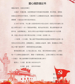 一方有难,八方支援。“爱心助学”帮助贫困地区家庭经济困难学生是每一位党员应尽的社会责任,是奉献爱心、造福他人的益举、善举,希望能在小雨乐的心中播下爱的种子,感受到党和社会的温暖,同时进一步倡导社会各界关注和帮助社会弱势群体,弘扬中华民族乐善好施、扶贫帮困的传统美德,倡导相互帮助、患难扶贫的时代新风!
