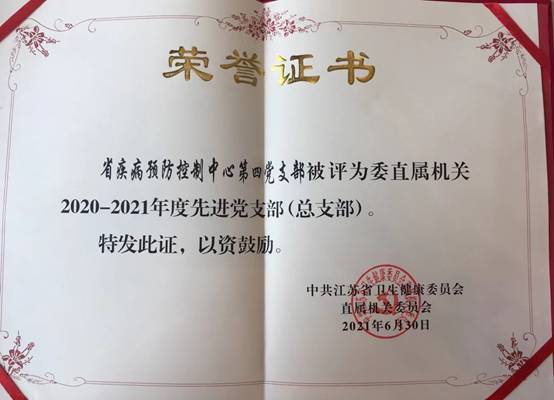 在庆祝建党100周年之际,第四党支部荣获委直属机关“先进党支部”的荣誉称号,面对肩上这份来之不易的荣誉和沉甸甸的责任,支部所有党员表示,将继续发挥党员的先锋模范作用,引领职工群众投身全省卫生健康事业高质量发展和健康江苏建设中,为全省健康事业和疫情防控工作贡献力量。
