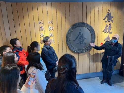 首先,各位党员与群众赴邵伯镇运河廉文化传承馆参观学习。古色古香的传承馆由启廉台、正廉堂、思廉院、尚廉阁、清风苑、承廉楼和清风传习所等七大板块构成,最先映入眼帘的就是启廉台那面青铜镜,可谓以镜照人、以古鉴今。讲解员为大家介绍专门为传承馆创作的廉赋,从召伯听政的故事开始,用谢安、张纲、董恂、左唐的廉洁故事昭示后人,以德方能服人,以廉方能服众。院内的百廉墙由苏轼、颜真卿、孙中山、毛泽东、邓小平等古今名家、领袖书写的“廉”字组成,让大家深深地感受到自古至今廉洁正气的传承。