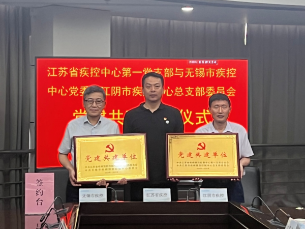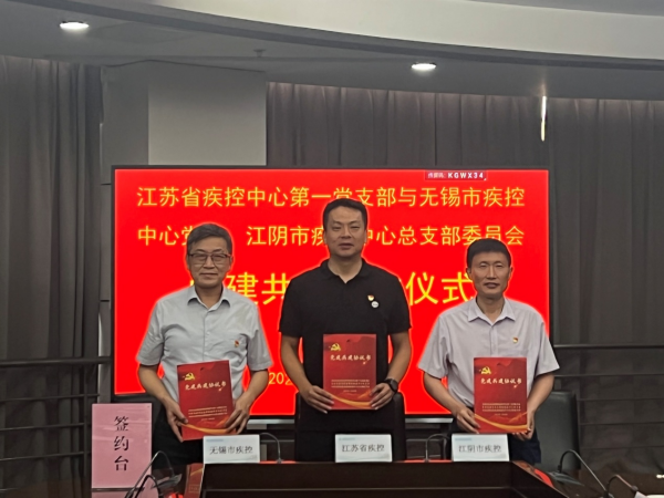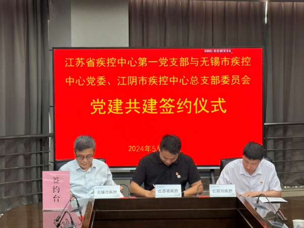 在深入学习贯彻党的二十大精神,落实新时代党的建设的总要求下,为进一步提升党建共建融合力,加强基层党建工作,以党建工作凝聚人心,推动党建工作向纵深发展,促进党建与业务深度融合,构建“资源共享、优势互补、共促共进”的党建工作新格局,在此次党建共建座谈会上,江苏省疾控中心第一党支部和无锡市疾控中心党委及江阴市疾控中心总支部委员就今后三方在党建共建方面的工作签署了《党建共建协议书》。江苏省疾控中心党委办公室主任胥翔、第一党支部书记单云峰等出席签约活动。中心党委办公室、第一党支部、团总支以及无锡市疾控、江阴市疾控等有关同志参加签约仪式。