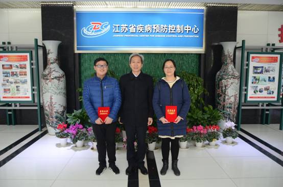 朱宝立书记为获得2015年度江苏省卫生计生委优秀共青团员荣誉称号的陈强和高茜茜颁发荣誉证书