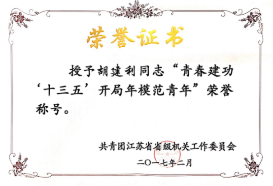 “青春建功‘十三五’开局年模范青年”胡建利事迹简介:胡建利同志2007年8月毕业以后进入江苏省疾病预防控制中心急性传染病防制所工作,是一名新时期“80后”疾控工作者。她始终秉承着爱岗敬业、积极进取的精神,在平凡的疾控岗位上,勤勉踏实地工作,悉心刻苦地钻研,默默无闻地奉献,多次获得江苏省卫生计生委优秀共产党员、省疾控中心先进工作者和优秀共产党员称号。作为江苏省国家突发急性传染病防控队正式队员,她负责或参与处置了多起突发公共卫生事件,起草、制定了《江苏省发热伴血小板减少综合征防控技术方案》、《江苏省登革热防控技术方案》、《江苏省寨卡病毒病防控技术方案》等;在2015年全国突发急性传病防控技能竞赛的综合笔试、技能操作和桌面推演等多个单项竞赛环节中名列前茅,为江苏代表队摘得总分全国第一、项目组一等奖的荣誉。近年来,结合防病工作实践开展科研创新,作为第一负责人主持1项国家自然科学青年基金项目和1项省卫生计生委重点项目;获得2项江苏预防医学科技奖二等奖和1项江苏医学科技奖三等奖,获得1项软件著作权;以第一和通讯作者发表文章近20余篇,其中SCI文章6篇,参编2部著作;2016年被评为“科教强卫”江苏省医学青年人才。