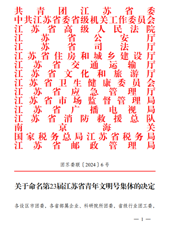 经严格审核和集中公示,共青团江苏省委联合省委省级机关工委、省高级人民法院等15家江苏省创建青年文明号活动组委会成员单位联合发文,命名江苏省疾病预防控制中心理化检验所应急检测组为第23届江苏省“青年文明号”。