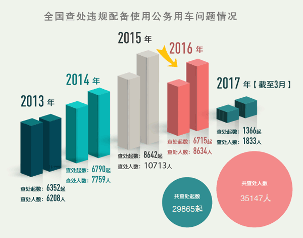 截至2017年3月31日,全国共查处违规配备使用公务用车问题29000多起,处理35000多人。其中,2013年共查处6300多起,处理6200多人;2014年共查处6700多起,处理7700多人;2015年查处8600多起,处理10000多人;2016年查处6700多起,8600多人。