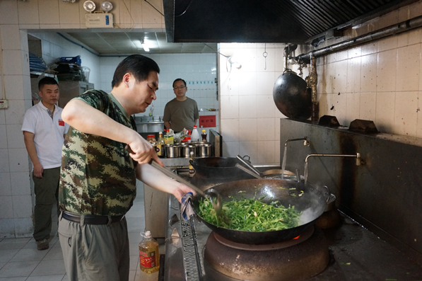 大厨的工作很辛苦。每天5点,天刚蒙蒙亮,两位大厨就开始了一天的劳作。早餐时间是7:30,大厨们要抓紧时间和面蒸馒头、煮鸡蛋、炒制小菜;为了满足46名队员的需求,馒头一般要蒸满满2笼,鸡蛋需要煮一大锅,而这些都必须在2小时内完成。炒菜用的锅是近20斤的大铁锅,加上食材,总重接近40手,王本四师傅本身就有肩周炎,可是为了保障一日三餐,他每天端着沉重的铁锅炒制10次以上。每天晚上回到房间,都必须靠药物和理疗缓解肩部的疼痛,可是他从来没有过因为身体不适而降低伙食品质。塞拉利昂地处热带地区,气温高湿度大,而被炉灶和各种烤箱蒸笼围绕的后厨,温度可想而知。两位大厨每次从后厨出来,都是汗流浃背。即便如此,他们也从来不懈怠一分,甚至坚持在所有人吃完饭之后,才为自己盛一碗饭。赵凤来师傅已经因为忙于后厨的杂事,好几次错过了饭点,不得不泡方面便充饥。大厨的奉献精神让队员们非常感动。