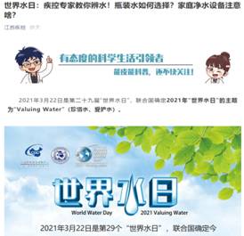 2021年3月22日是第二十九届“世界水日”,联合国确定今年“世界水日”主题是“Valuing Water”。依据《“健康中国2030”规划纲要》和《健康中国行动(2019-2030年)》,为推进健康环境促进行动,江苏省疾控中心组织南京市、无锡市、盐城市疾控中心举办围绕“珍惜饮用水健康中国人”为主题的系列宣传活动。