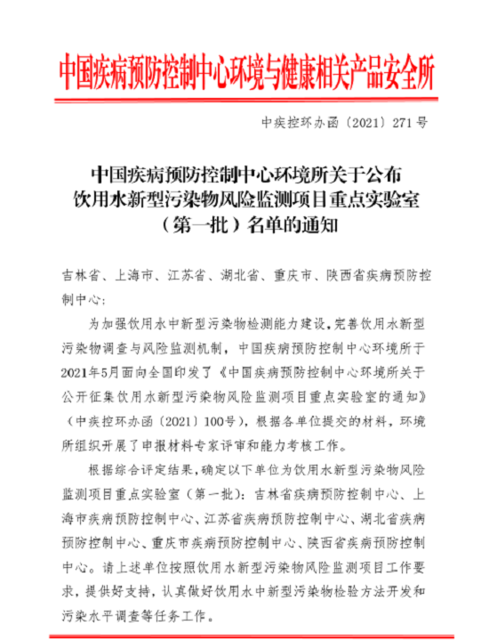 国家疾控环境所于2021年5月面向全国疾控印发了《中国疾病预防控制中心环境所关于公开征集饮用水新型污染物风险监测项目重点实验室的通知》,全国共有25家省级疾控中心参与申报。国家疾控环境所组织开展了申报材料答辩评审以及盲样考核工作,中心理化所成功通过项目答辩以及55种盲样考核,从25家省级疾控中心中脱颖而出,成为6家首批获得饮用水新型污染物风险监测项目重点实验室之一。