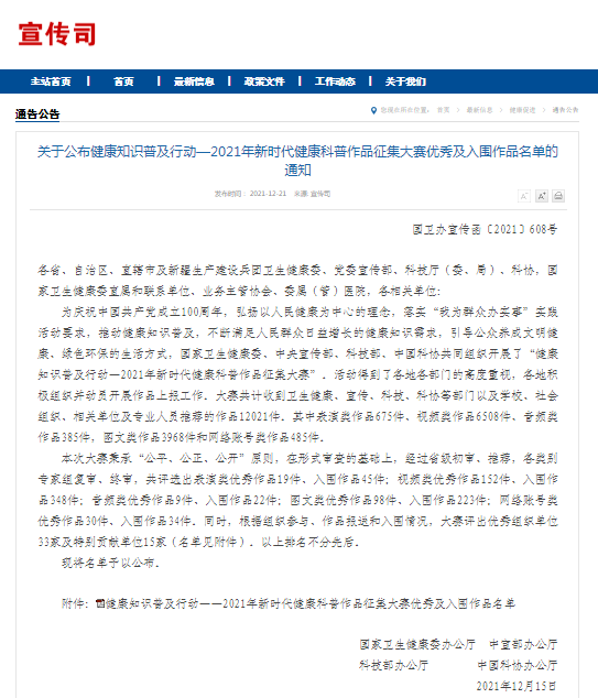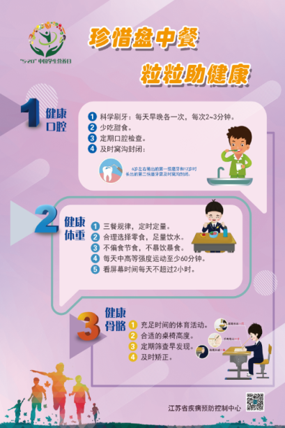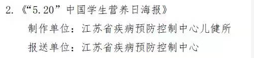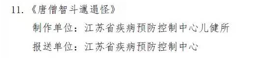 为庆祝中国共产党成立100周年,弘扬以人民健康为中心的理念,落实“我为群众办实事”实践活动和推动健康知识普及,国家卫生健康委、中央宣传部、科技部、中国科协共同组织开展了“健康知识普及行动—2021年新时代健康科普作品征集大赛”。江苏省疾控中心儿童青少年健康促进所选送的《唐僧智斗邋遢怪》宣传诺如病毒防控动画片和 “520”中国学生营养日海报分别喜获动漫类、电视节目类优秀作品,选送的《新学期疫情防控必修课》获得电视节目类入围作品。
