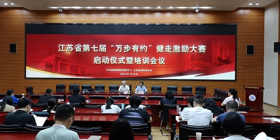 2022年6月28日,第七届“万步有约”健走激励大赛江苏省启动仪式暨培训会在南京举办。江苏省疾控中心党委书记朱宝立出席启动仪式。来自全省21个参赛县区代表及相关设区市全民健康生活方式骨干技术人员50多人参加会议。