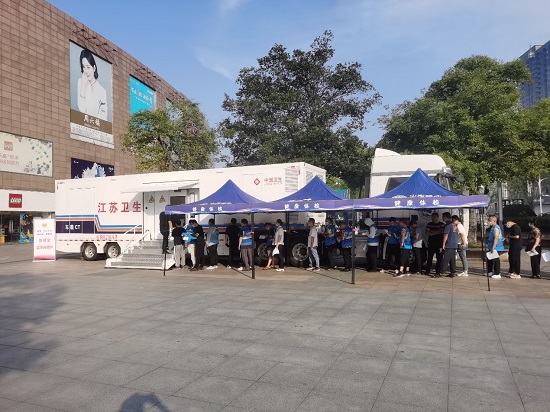 2022年6月13日起,随着江苏省总工会“关爱外卖小哥等新就业群体8+X公益性体检”在南京市栖霞区拉开序幕,作为公立的公共卫生服务机构,中心职防所积极配合总工会做好这项暖心服务,专项体检组的同志们带着新装备“车载CT”已连续在户外奋斗了两个月有余。为了服务更多的新就业群体,专项体检组的成员们每天上午6:00开工,12:30左右结束一个地区的工作简单午饭后随即开始整理体检设备、耗材,直接赶往下一个体检地点,短短60余天共奔赴13个地级市、52个区县。天气炎热、加上室外工作的暴晒,大家都“瘦了一圈、黑了一个色号”。放射科周琅因急性鼻窦炎引起头痛、发热,去医院输液后随即投入到工作,大家问他为什么不好好在家休息休息,他半开玩笑半认真的说“多一个人多一份力呀!再说和咱们的超级车载CT在一起,有一种和超级英雄一起拯救世界的感觉。”大家互帮互助,克服高温的灼热和路途的劳顿,完美的完成了每一个地点的体检任务。