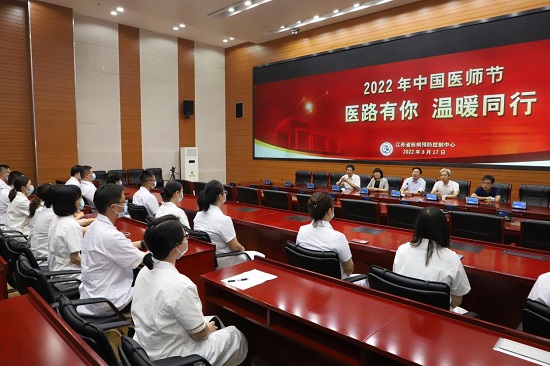 2022年8月17日上午,江苏省医师协会副会长兼秘书长刘彦群带队,在中心C楼208会议室向奋战在抗疫一线的省疾控中心医师代表们送去节日祝福。省疾控中心党委书记朱宝立、中心党委副书记、副主任徐燕、中心纪委书记周永林出席慰问仪式。