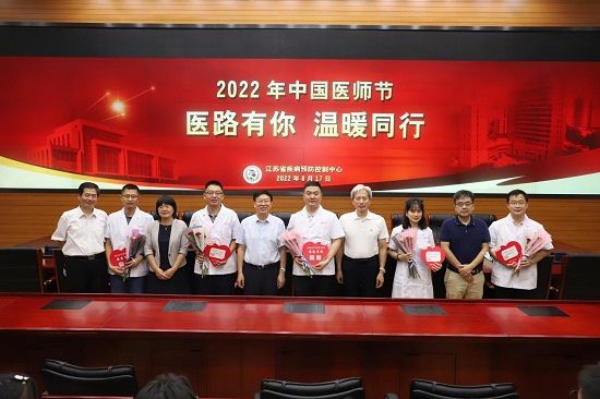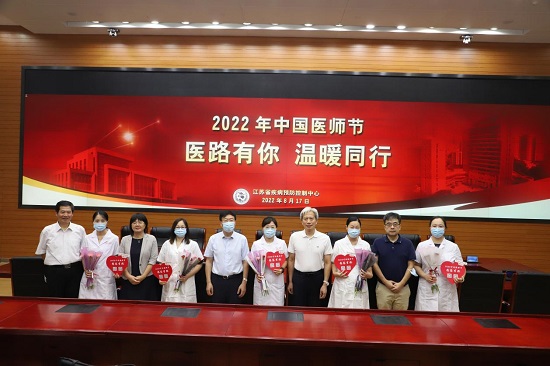 “这支鲜花送给您,我们祝您节日快乐!”江苏省疾病预防控制中心的医师代表们收到了江苏省医师协会带来的祝福,一支支鲜花和一张张感谢卡不仅烘托出特殊的节日气氛,也让大家感到温暖。