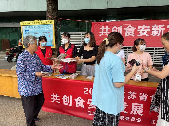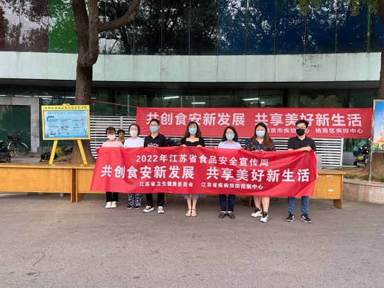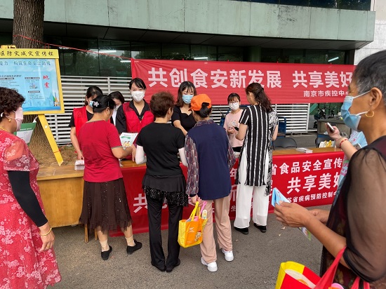 9月8日,省卫健委、省疾控中心联合南京市疾控中心、栖霞区疾控中心组织相关人员前往栖霞区尧化街道尧林仙居小区南门广场开展“共创食安新发展共享美好新生活”为主题的2022年食品安全宣传周进社区活动。