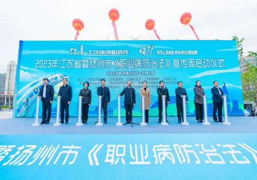 2023年4月24日,2023年江苏省《职业病防治法》宣传周启动仪式在扬州举行。江苏省卫生健康委副主任周明浩、扬州市副市长刘流、扬州市卫健委主任赵国祥、扬州经开区管委会党工委副主任臧灿甲出席启动仪式并致辞。启动仪式由扬州市卫生健康委副主任缪彦主持。今年4月25日至5月1日是全国第21个《职业病防治法》宣传周,主题为“改善工作环境和条件,保护劳动者身心健康”。本次活动由江苏省卫生健康委、江苏省民政厅、江苏省人力资源和社会保障厅、江苏省医疗保障局、江苏省总工会联合举办,江苏省疾控中心、江苏省卫生健康委药品药具管理中心、扬州市卫生健康委、扬州市经开区管委会承办,扬州市疾控中心、扬州市卫生监督所、扬州市药具管理站协办。省卫生健康委、省疾控中心、省卫生监督所、省卫生健康委药品药具管理中心相关业务部门负责同志,扬州市相关对口单位负责同志,企业和劳动者代表共约200人参加活动。
