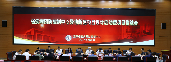2023年9月18日下午,中心异地新建项目设计启动暨项目推进会议召开。江苏省疾控中心党委书记朱宝立出席会议。江苏省住房和城乡建设厅政府投资工程集中建设管理处副处长蒋伟、江苏省公建中心副总经理李再莅、东大建筑设计院副总经理曹伟和省城市规划设计集团党委副书记张伟等有关责任人参加会议。