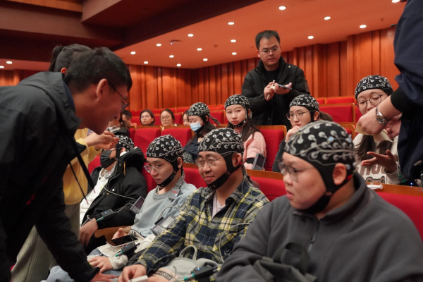 工作人员为现场受试学生佩戴脑电监测仪