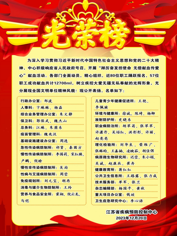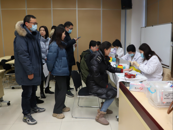 2023年12月20日上午,中心组织全体职工在C1楼开展“踔厉奋发担使命 无偿献血传爱心”无偿献血活动。江苏省疾控中心党委副书记、副主任、工会主席徐燕带领工会相关同志提前到现场服务,并慰问义务献血的职工。