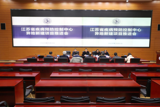 2024年1月8日,南京江北新区党工委委员、管委会副主任王伟,专程带领江北新区卫生健康和民政局局长陆小军、规划和自然资源局副局长周飞、行政审批局副局长姚旭、建设与交通局园林与人防办主任顾大圣等一行6人,就江苏省重大项目——江苏省疾病预防控制中心异地新建项目推进事宜到中心调研交流。江苏省卫生健康委副主任、江苏省疾病预防控制局局长周明浩、江苏省卫生健康委规划发展和信息化监察专员王爱年、江苏省卫生健康委疾病预防控制处处长陆伟,江苏省疾病预防控制中心党委书记朱宝立及东大设计院相关负责人等参加会议。