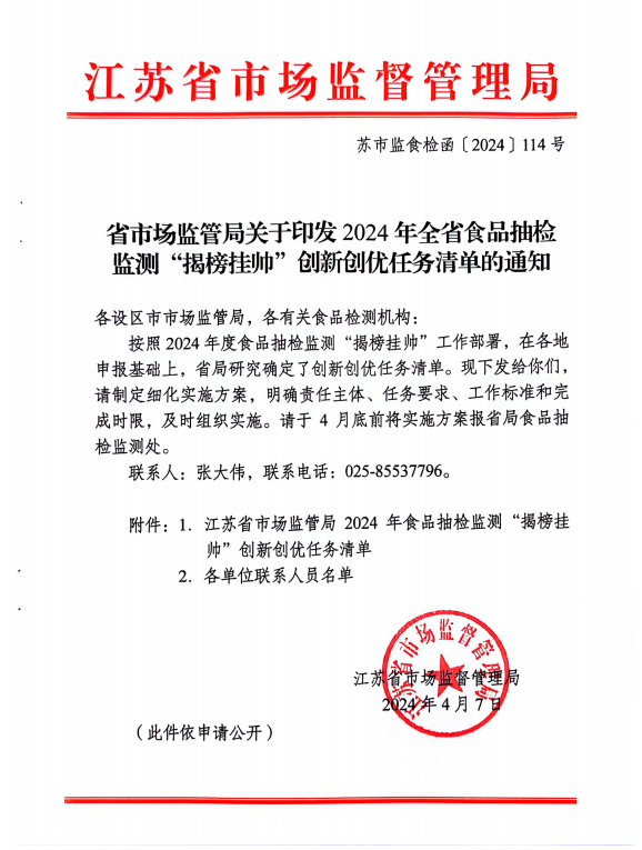 2024年4月10日,中心收到“省市场监管局关于印发2024年全省食品抽检监测'揭榜挂帅'创新创优任务清单的通知”,经过申报,中心成功揭榜,内容为新形态食品、新污染物和多污染物共存状态下的食品安全风险防控,是“揭榜挂帅”成功的19个单位中,主管部门非省市场监管局的2家单位之一。