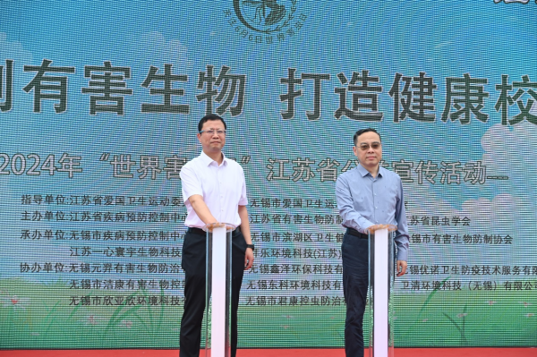 5月30日,2024年“世界害虫日”江苏省公益宣传活动在无锡市顺利举办。今年的“世界害虫日”主要关注校园健康,活动主题是“校园健康和有害生物防制”。健康的校园是“健康江苏”和“健康中国”的应有之义,本次活动受到省、市和区各级领导的普遍关心。江苏省卫生健康委二级巡视员吴红辉、四级调研员储剑伟,江苏省疾控中心消媒所所长、江苏省有害生物防制协会副会长兼秘书长、江苏省昆虫学会副理事长褚宏亮,江苏省有害生物防制协会副会长、江苏功成生物科技有限公司董事长蔡伯林,江苏省有害生物防制协会副会长、南京洁安有害生物防制有限公司总经理徐晓光,江苏省有害生物防制协会常务副秘书长张爱军,无锡市卫生健康委副主任、市爱卫办主任陈恩品,无锡市疾控中心主任焦建栋,无锡市卫生健康委健康促进处处长邬先赞,无锡市疾控中心副主任周伟杰,滨湖区红十字会副会长何霞,无锡市疾控中心消媒科副科长兰策介,以及无锡市有害生物防制协会秘书长邹亚明等领导嘉宾出席了本次活动。