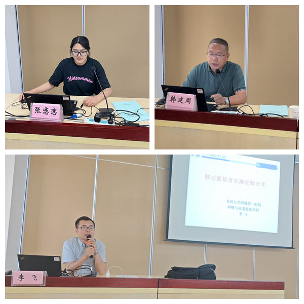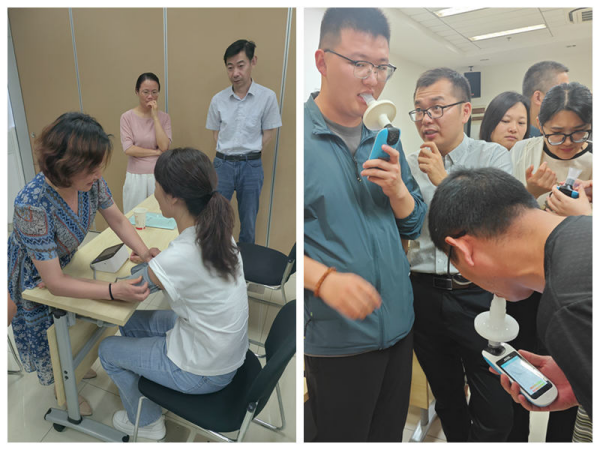 在培训环节,省疾控中心慢非传所范习康、万亚男、李梦夏和研究生龙缈分别围绕项目的总体方案、问卷调查与质量控制、平板系统操作和管理,以及现场血样本收集方法进行了专项培训。宿城区疾控中心慢病科科长张恋恋分享了当地开展慢阻肺综合防控项目的经验。通州区疾控中心慢病科科长韩建周讲解了体格检查规范和注意事项,并指导参训人员练习。苏州大学附属第一医院呼吸与危重症医学科副主任技师李飞介绍了肺功能检查要点和结果解读,并对简易肺功能仪器的操作进行了现场指导。
