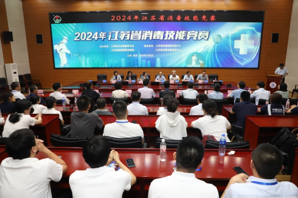 2024年7月8日,2024年江苏省消毒技能竞赛在南京举办。竞赛由江苏省卫生健康委员会、江苏省疾病预防控制局主办,江苏省疾病预防控制中心和江苏省消毒质量控制中心承办。江苏省卫生健康委副主任、疾控局局长周明浩、江苏省疾控中心党委书记朱宝立、江苏省卫生健康委监督处处长周群霞、江苏省卫生监督所所长吴涛、江苏省疾控中心党委副书记、副主任徐燕、江苏省卫生健康委医政处四级主任科员钱超出席会议。全省各地卫生健康部门、疾控机构、医疗机构、卫生监督机构积极响应本次活动,每个设区市遴选4名参赛选手以及1名领队和1名联络员组成市级代表队参赛,来自全省13个设区市的13个代表队和在宁委直属医疗、疾控、监督单位在内共计70人齐聚南京,展开激烈角逐。
