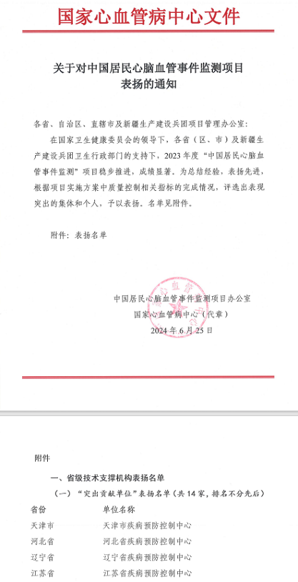 国家心血管病中心鉴于全省心脑血管监测工作突出成绩,近期表彰2023年全国心脑血管事件监测项目实施单位,省疾控中心获省级“突出贡献单位”,慢非传所覃玉主任医师获省级“优秀组织者”;常州市、南通市、连云港市疾控中心获市级“先进单位”;滨湖区、泉山区、吴江区、海门区、姜堰区、沭阳县疾控中心获县(市、区)“先进单位”;高淳区、滨海县、金湖县、广陵区疾控中心心脑血管事件监测工作人员获县(市、区)“优秀组织者”。全省报卡医疗机构业务人员10人获“先进个人”。