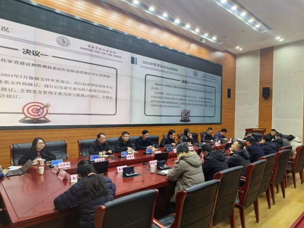 会上羊海涛主任对2023年管理评审决议的完成情况、2024年实验室管理体系运行情况、生物安全工作情况、BSL-3实验室工作情况、内部审核报告情况进行报告,并对中心管理体系目标和方针总体进行评价:2024年中心的管理体系能持续符合相关文件及规定要求,管理体系适应中心的实际运行情况,结合中心内外环境和政策的变化,体系的运行是有效的;各项质量管理活动与检测技术工作及支持服务保障等过程的开展较充分;客户满意度问卷调查和窗口暗访活动,中心连续数年获得客户好评,各项质量目标、指标已经达标;质量和生物安全方针、目标是适宜、可行的,并且成为全体员工自觉遵循的原则、行动的指南、实际的行动和努力方向。